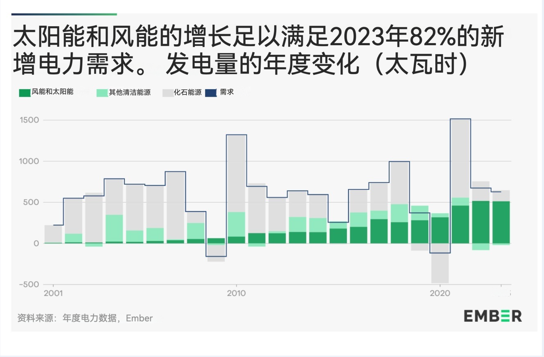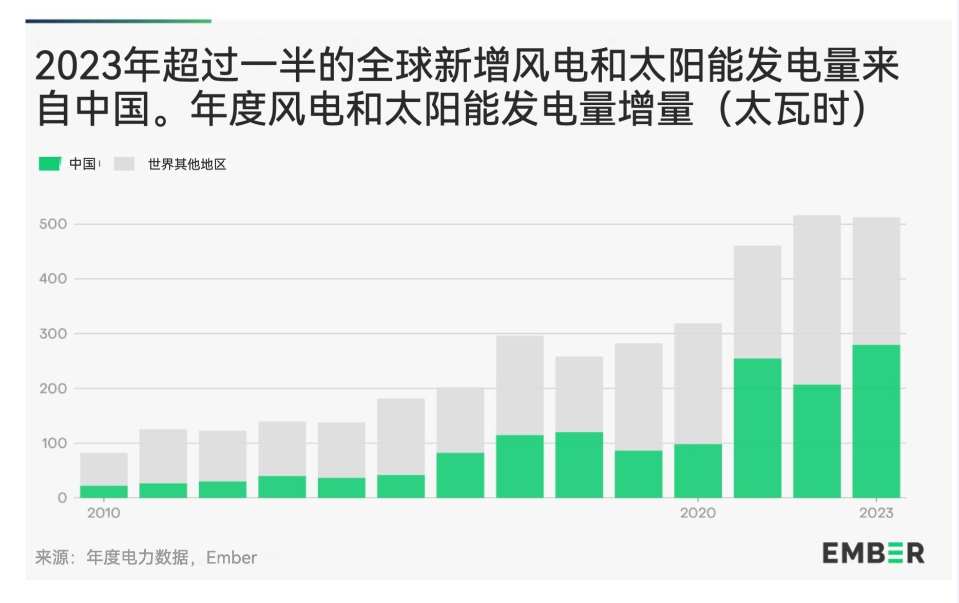 2023 年,仅中国的风能和太阳能发电量就占全球新增发电量的一半以上。