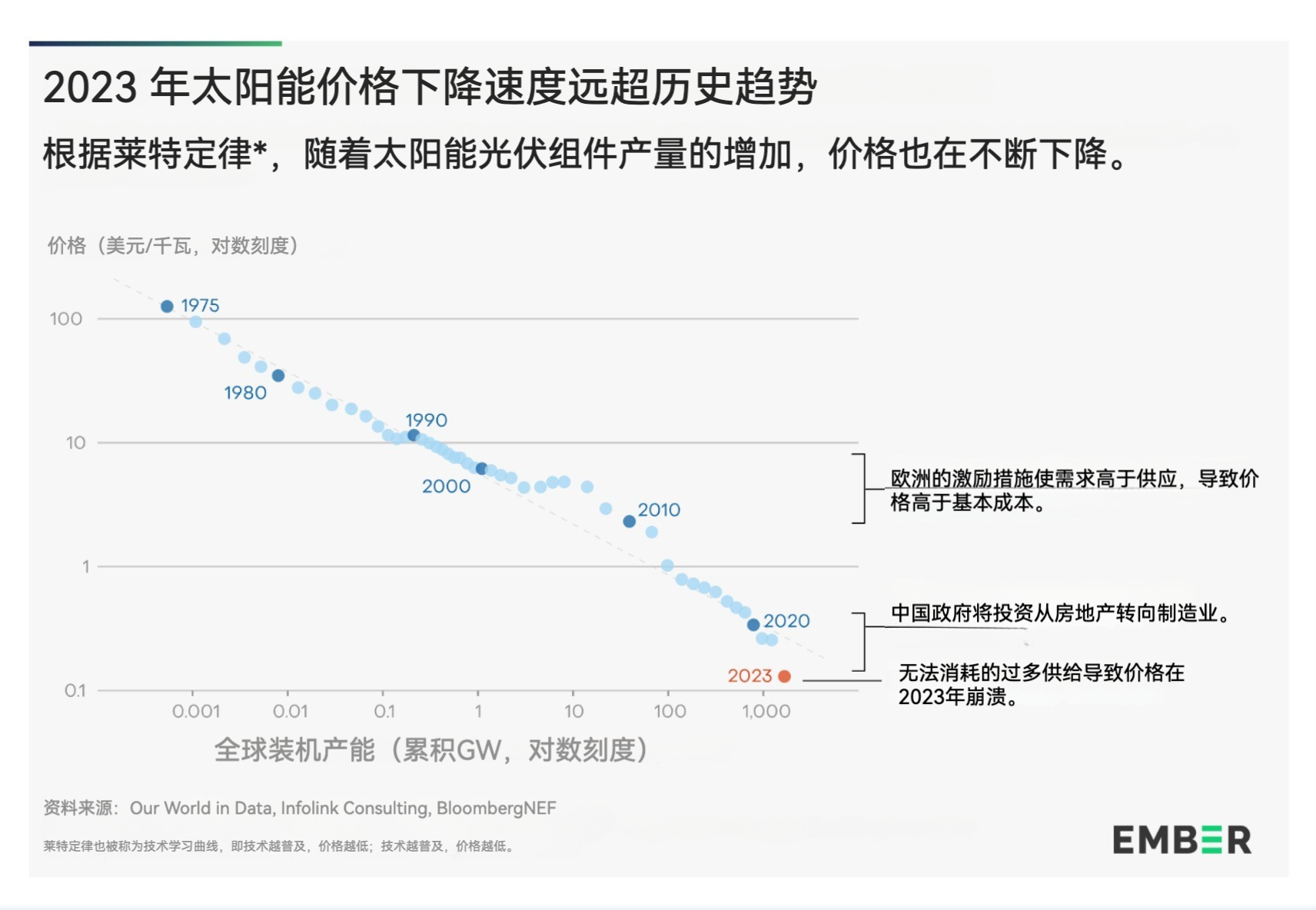 2023 年,中国生产的太阳能产品数量超过了全球需求,下半年组件现货价格暴跌 50%以上,推动国内安装量越来越高。目前,太阳能组件价格大大低于根据莱特技术学习曲线定律 (Wright’s law of technology learning curves)所预期的价格。随着中国的国家信贷(state lending)越来越多地从房地产领域转向制造业,中国目前占全球太阳能组件产量的80-85%。