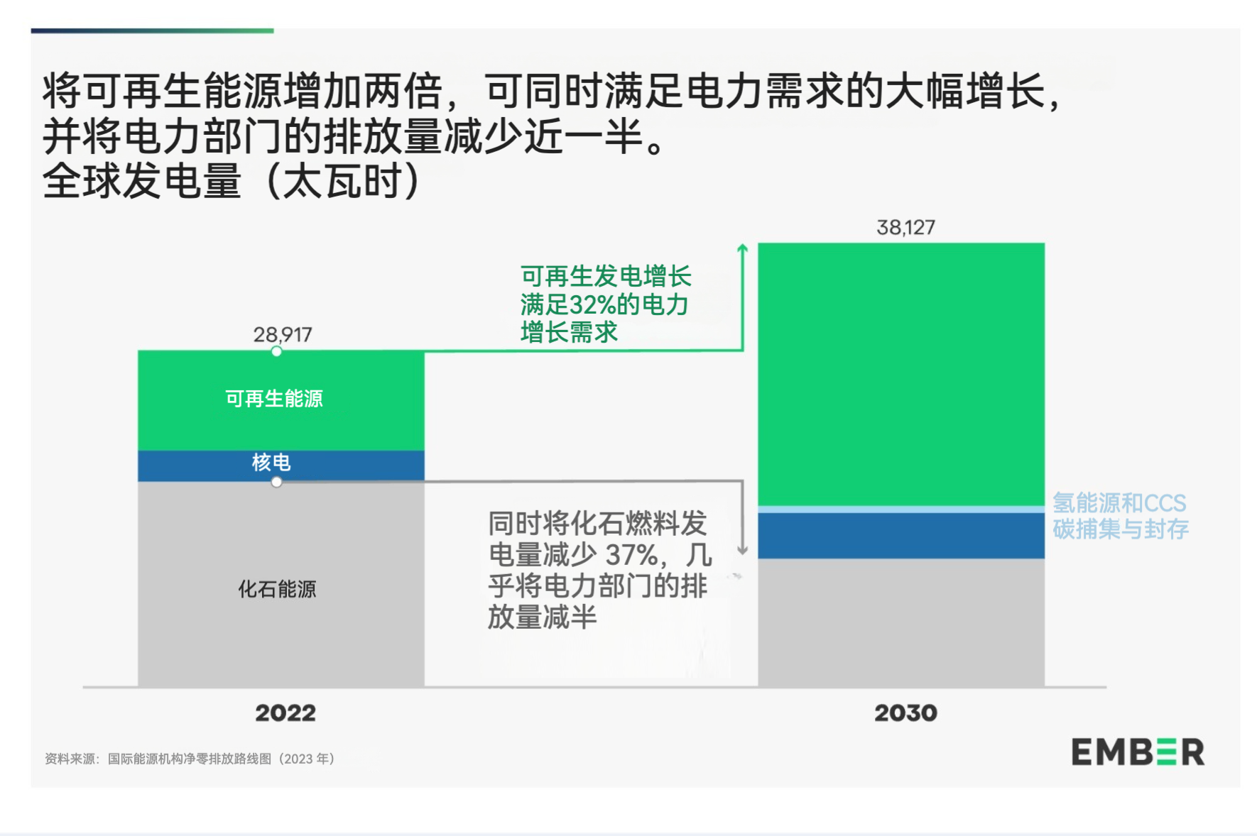 在2023 年的 COP28 气候峰会上,全球许多国家承诺到2030 年将全球可再生能源发电能力增加两倍。由于燃煤发电将首先被取代,这有可能在 2030 年前将电力行业的排放量减少近一半。此外,在电力需求增长 32% 的情况下,这将提供足够的新电力来替代推动交通、家庭和工业供暖电气化。
