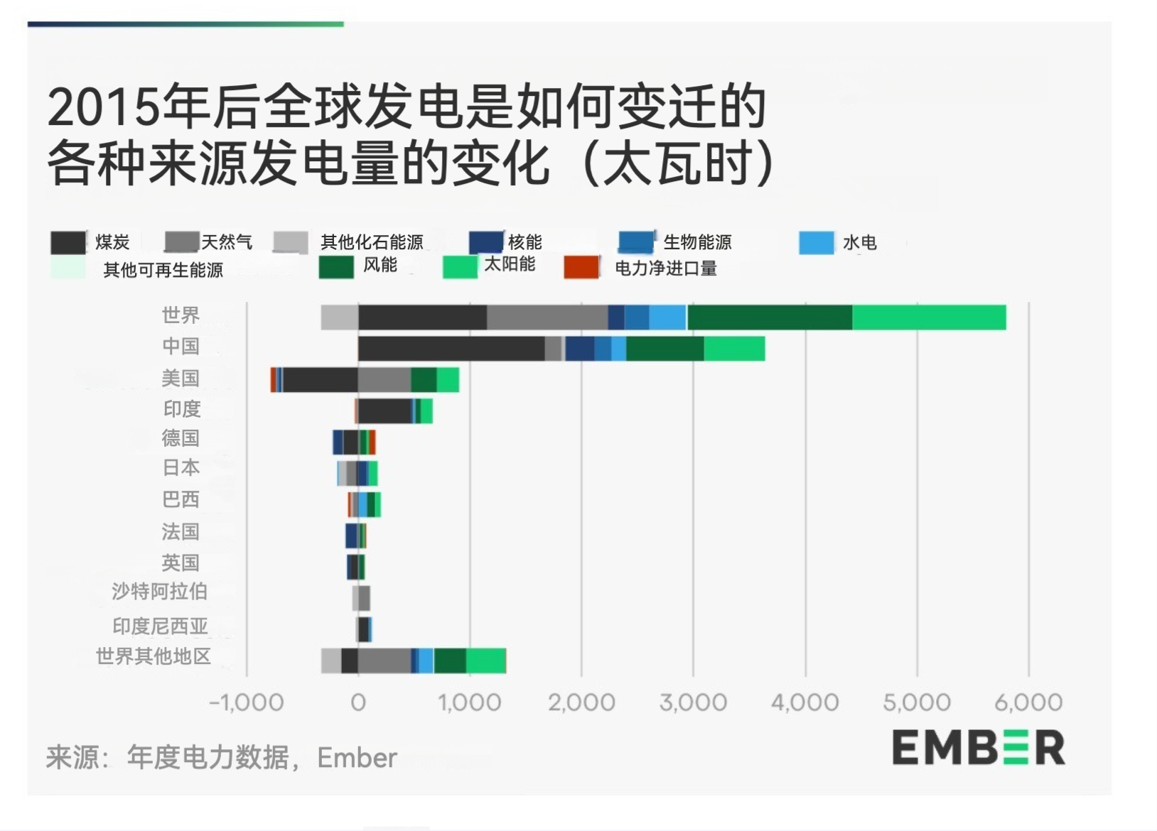 自2015 年以来,中国煤炭发电量的增长(+1,670 太瓦时)超过了全球总体增幅,而在此期间,美国和其他国家的煤炭发电量大幅下降。