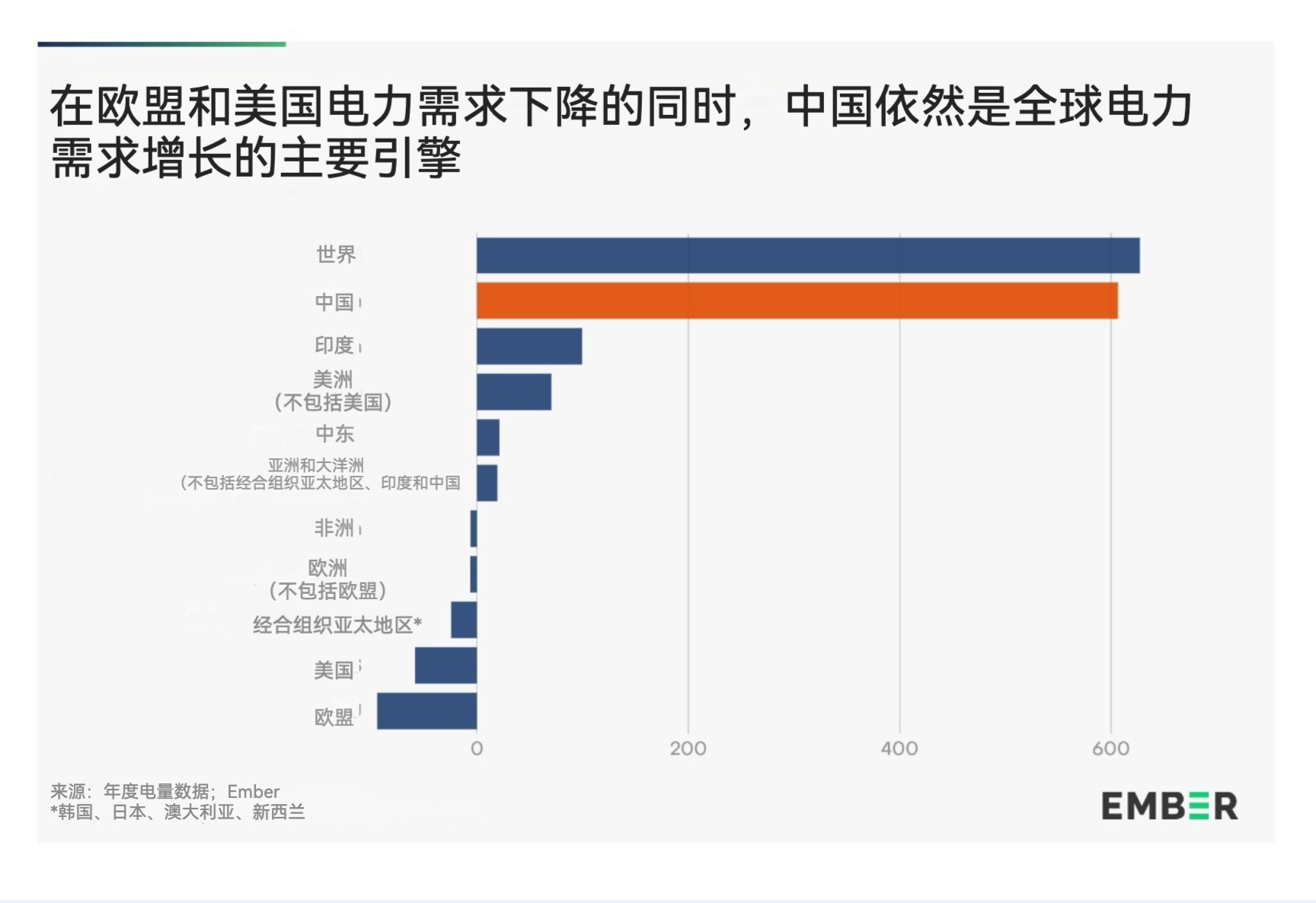 正如Ember 的数据所示:“中国仍然是全球电力需求增长的主要引擎。中国的快速增长(+606 太瓦时,+6.9%)仅比全球净增长低 21 太瓦时。印度的增长(+99 太瓦时,+5.4%)是第二大贡献者。”