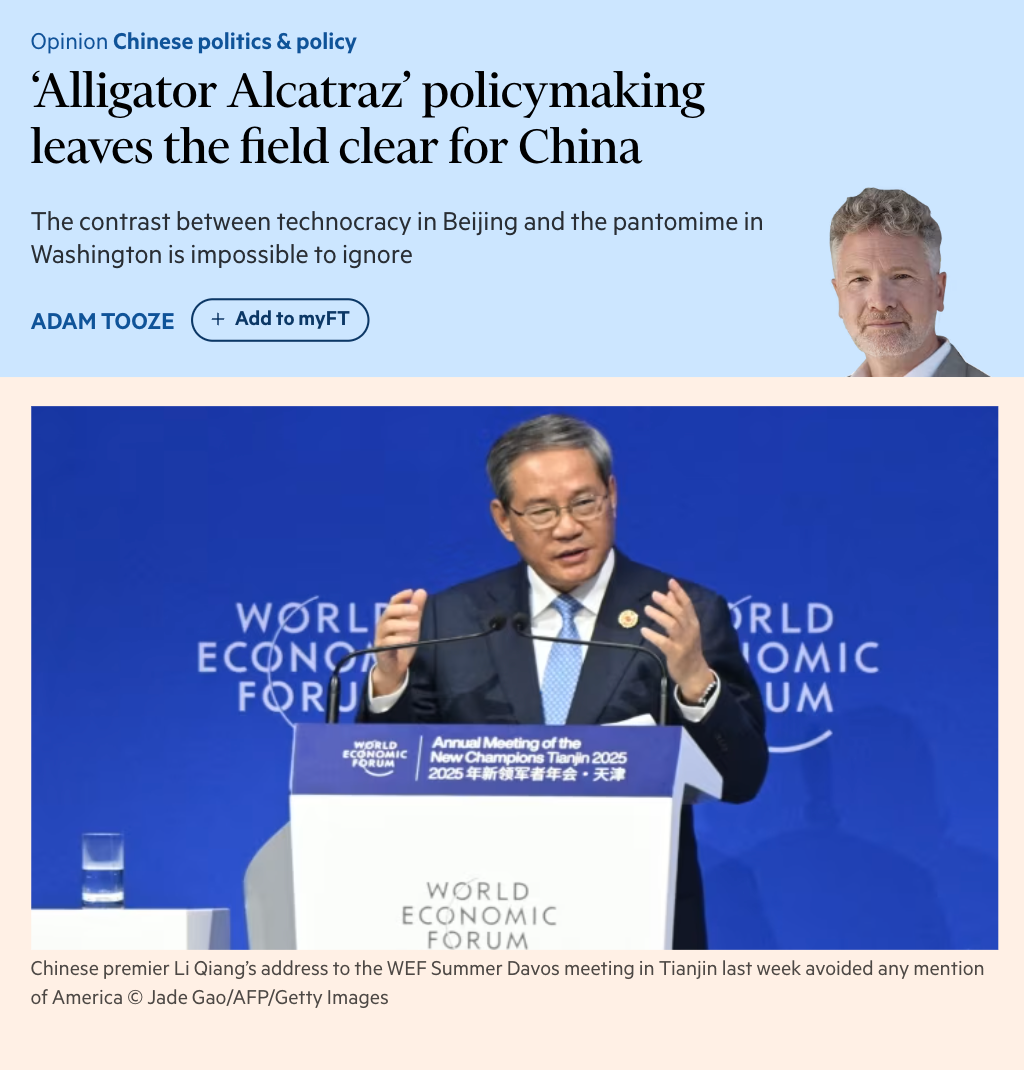如今回想起来,我意识到,在天津夏季达沃斯论坛后为英国《金融时报》撰稿的首篇文章,仍深深陷于两种冲击的比照之中:一边是特朗普政府那段如同被困在“鳄鱼恶魔岛”般的混乱时期,另一边则是初抵中国时的心灵震撼。