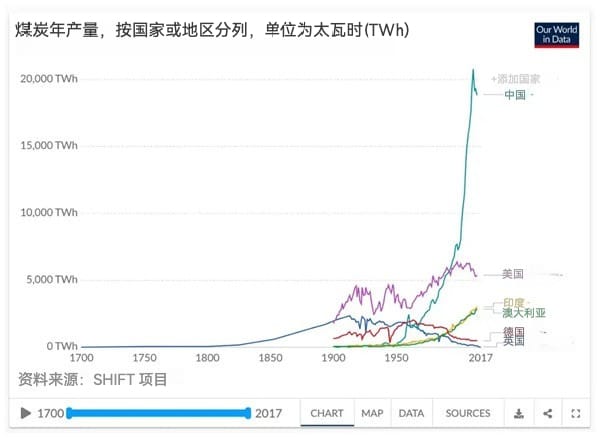 这张来自“数据看世界”网站的图表,是我能在演示板上呈现的最震撼的图示之一。但多数时候我们看着它只是耸耸肩:“哦,是啊,事情本来就是这样。”请再看一眼!这是人类有记录以来的煤炭产量曲线。这是马克思意义上的“类存在”(species being)——所有曾经生活过的人类。这是他们迄今为止挖掘的全部煤炭。无需多言,煤炭是现代城市工业发展的绝佳标尺。没有它,就没有工业革命,没有工业资本主义,没有完整的有机剩余价值生产与剥削——正如马克思在19世纪著述中所揭示的。