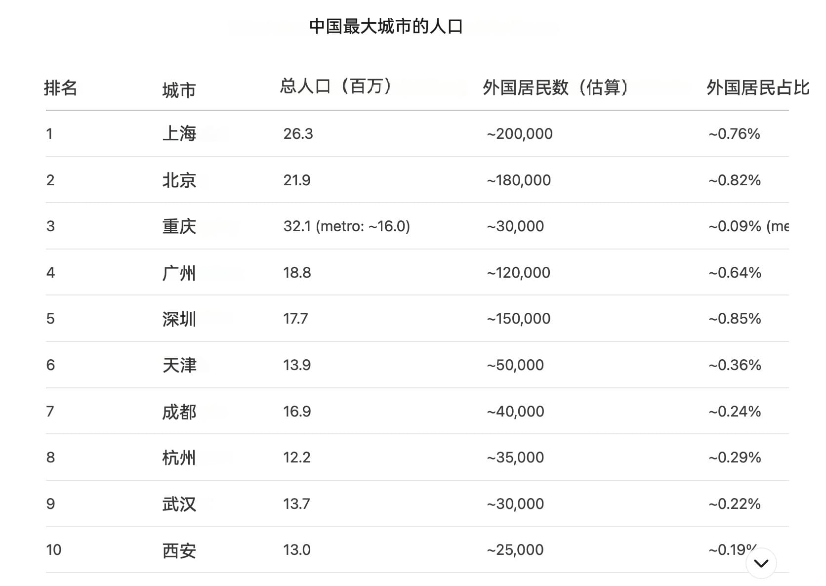 当这种体验的陌生感偶尔猛然将我拉回现实,我便请 DeepSeek 编译了一些中国主要城市的外籍人口数据。它提供了以下数字——根据经验以及针对成都等地的具体搜索来看,这些数据似乎有些偏高了。