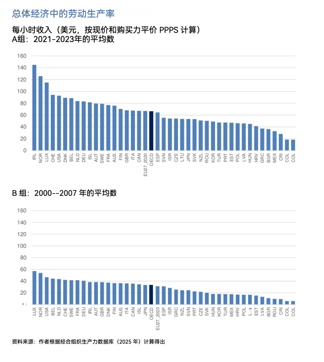 国际劳工组织、经合组织与年度宏观经济数据之间的差异,似乎可以通过劳动投入的统计口径来解释。若计入相对较高的劳动投入,则每小时产出数据会相对降低。