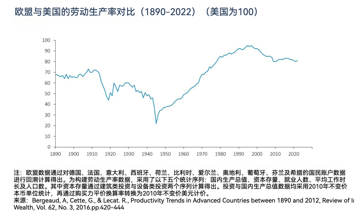 除了每小时劳动生产率,我们或许还应追问:欧美生产率差异在多大程度上源自美国更高的投资水平?人均资本量的增加理应带来更高的生产率,但这并非没有代价,这意味着需要压缩消费来为投资“腾出”空间。因此衡量经济表现的真实标尺应是全要素生产率。如果欧洲既未过度劳动也未大力投资,那么这同样是其社会合意(social bargain)的一部分。只要全要素生产率保持高位,这样的合意也许还是可以接受的,我们不妨称之为“步履蹒跚地走向乌托邦”(布拉德·德隆语)。