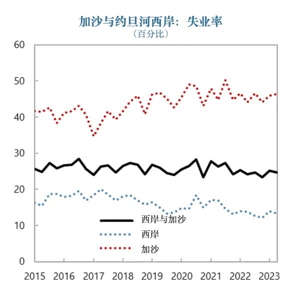 从数据可以看出,尽管西岸地区沿用的是依赖型经济发展模式(即罗伊所说的“去发展化”),其经济自2003年来稳定增长,而加沙经济则自90年代以来一直维持在同一水平,自2006年哈马斯上台以来更是停滞不前。算上这十几年的人口增长,如今加沙的人均国内生产总值(GDP)仅为90年代中期水平的一半,西岸的三分之一。同时,加沙的贫困率超过50%,而西岸为14%。在此次冲突爆发前,加沙的失业率徘徊在40%至50%之间。