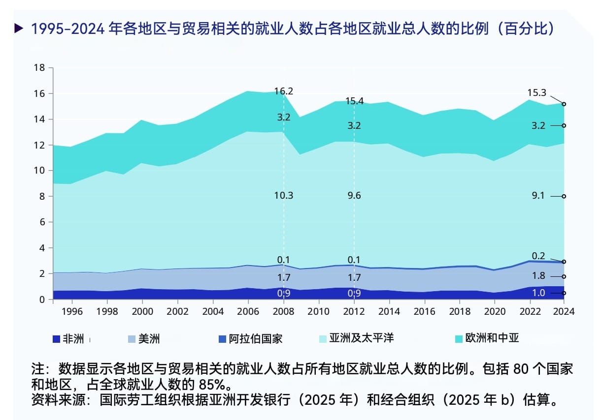 在80个拥有数据的国家和地区中,2024年全球货物与服务贸易相关就业岗位达4.65亿个,占总就业量的15.3%。贸易相关就业包含所有直接及通过供应链间接满足国外需求的活动,其区域分布基本反映了劳动力规模差异:亚太地区占据半数以上份额(2.78亿),其次是欧洲和中亚地区(9600万)。各区域贸易相关就业占比差异显著:非洲仅占12.3%,而欧洲和中亚地区达24.6%。在亚太地区内部,东南亚尤为突出,其就业中高达24.1%与贸易相关。