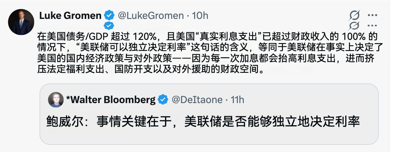至于财政层面的分析,卢克·格罗门(Luke Gromen)这条有趣的推文提供了颇具说服力的见解。